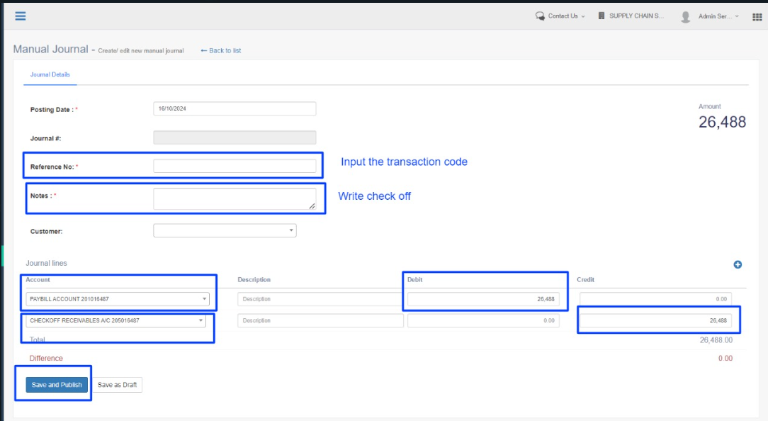 - Ensure you input the correct amount to the debit and credit field - DR Paybill CR Check off receiveables