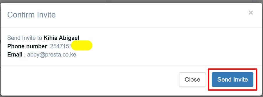 8. A pop-up containing the customer's contacts will appear, click on the send invite button and the customer will receive an SMS.
