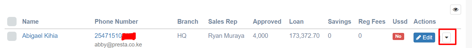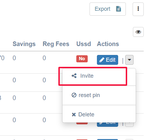 6. To invite the customer to use USSD, search for the customer in the customer list and click on the arrow under the actions tab as shown below