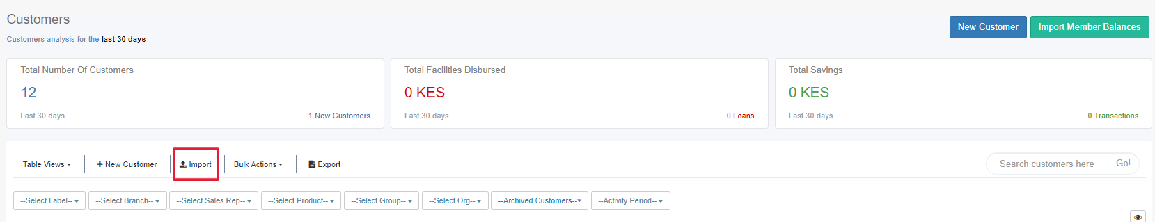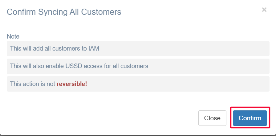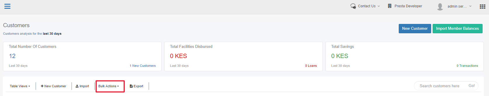 6. To sync all customers to the IAM to integrate them with the USSD, click on Bulk Actions and select Sync All Customers.