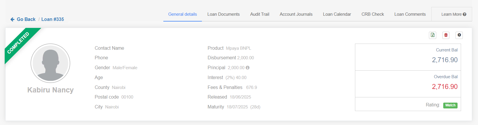 Once you locate the loan you should click on their name and it will load the loan profile as shown below