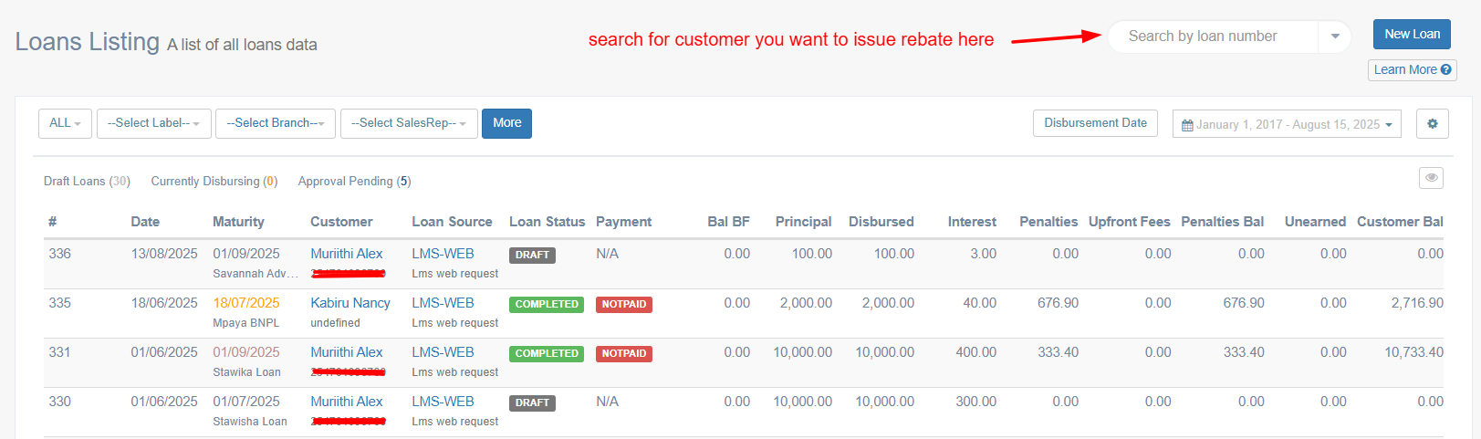 To view the profile of a specific customer: 1. Click on 'customers' dropdown as shown below 2. Search for the customer. 3. Click on the customer's name. The customer Profile will contain information such as: Loan Accounts - Shows a list of loans ...