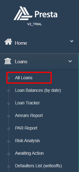 Once you are in Presta (Loan Management) select loans and choose "All Loans"