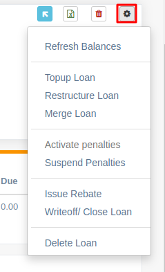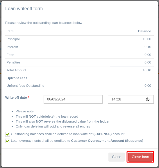 Writeoff/ Close Loan -> This writes off the whole of the remaing outstanding balance of a loan.