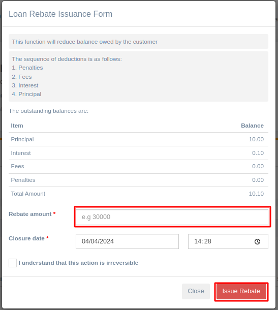 Issue Rebate -> This allows you to give a discount on the outstanding balance of a loan.