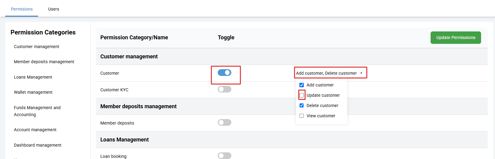 - Once you have activated all the permissions as desired. Click on Update Permissions to save the permissions.
